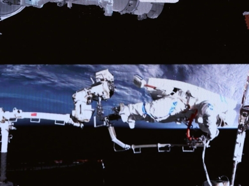 2026-03北京时间2026年3月16日19时35分,经过7小时的出舱活动,神舟二十一号乘组航天员张陆、武飞、张洪章密切协同,在空间站机械臂和地面科...