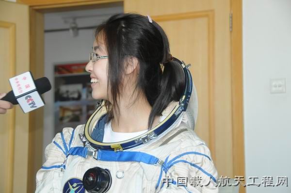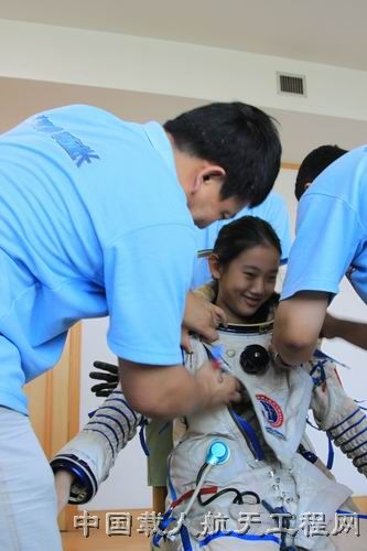 7月21日,2010航天员体验营?民族营的营员们试穿舱内航天服,穿上这套价值不菲的航天服,营员们兴奋不已。(摄影:王楠楠,左佳贺)