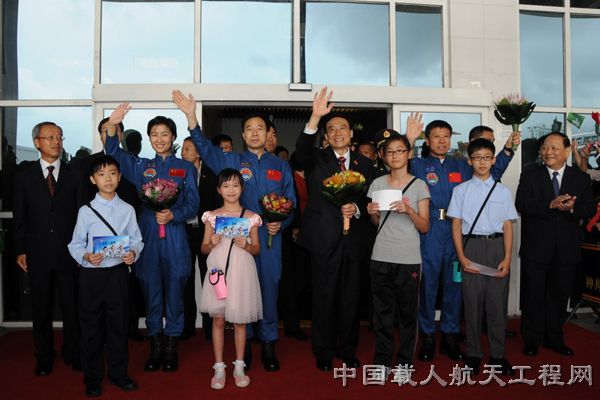 代表团抵达港澳码头时,受到在场500多名学生及群众的热烈欢迎,4名学生代表向团长牛红光及三名航天员景海鹏、刘旺、刘洋敬献了鲜花。